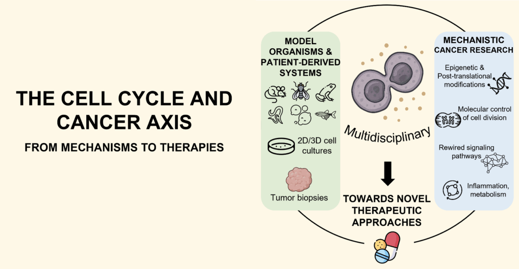L’axe « Cycle cellulaire et cancer » réunit 12 équipes multidisciplinaires pour étudier des aspects clés de la biologie du cancer, avec un accent particulier sur la régulation du cycle cellulaire.